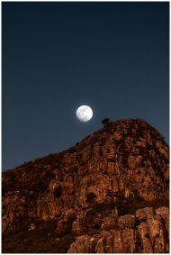 Full moon rises over a rocky cape in South Africa's night sky, creating a serene nature scene.