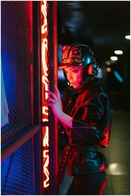 Woman in a cyberpunk helmet and jacket with vibrant neon lighting.
