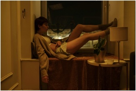 A woman sits by a window at night, exuding a vibe