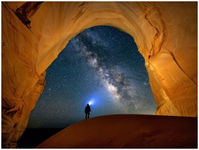 Explore the breathtaking view of the Milky Way through a natural arch in Kanab, Utah.