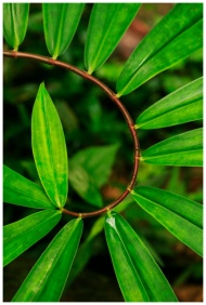 Vibrant green bamboo leaves form a spiral pattern