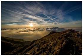 Breathtaking sunrise over mountains with dramatic clouds and clear sky.