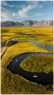 Stunning drone view of a winding river through lush green plains and mountains.