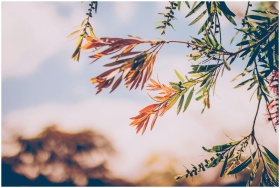 Close-up of colorful autumn leaves on a branch, under a bright sky in Bogotá.