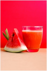 Refreshing watermelon juice and slice against a vi