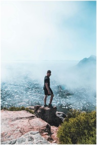 Man standing on rocky cliff with scenic view over Cape Town; foggy, adventurous vibe.