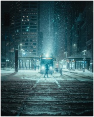 A snowy night scene with tram in downtown Minneapo