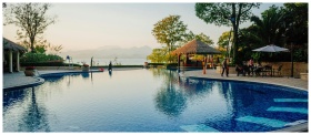 Serene resort pool with sunset views, ideal for relaxation and leisure travel.