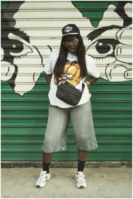 Stylish woman in casual attire standing before a creative graffiti backdrop.
