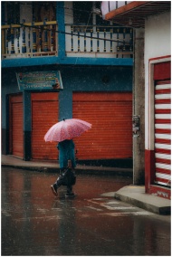 A person with an umbrella walking through a colorful urban street during a rainy day.