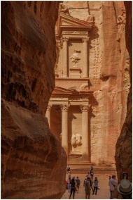 View of the famous Petra Treasury from the narrow Al-Siq canyon in Jordan, captured in warm daylight.