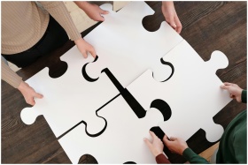 Group collaborating on assembling large puzzle pieces symbolizing teamwork and unity.
