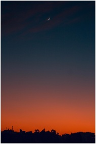 A serene crescent moon in a colorful dusk sky above a city silhouette, capturing twilight's beauty.