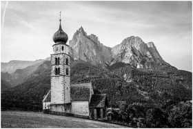 A black and white image of a church against a stunning mountain backdrop in South Tyrol.