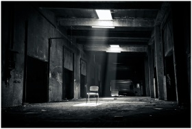 A haunting black and white photo of an abandoned warehouse with a solitary chair illuminated by sunlight through a window.