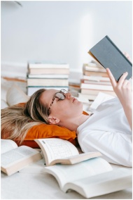 A young woman lies on pillows, engrossed in a book