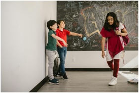 Children engaging in a bullying scene inside a school's hallway with chalkboard wall.