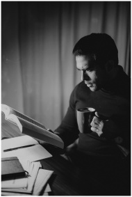 A focused man reading a book and holding a coffee cup in a dark, monochrome setting at night.