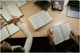 Group of adults studying together with open books