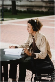 Cheerful student studying outdoors with headphones, enjoying music while preparing for exams.