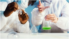 Two scientists working with chemicals in a lab, fo