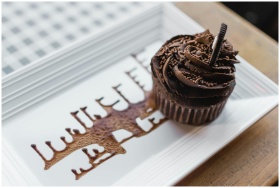 Close-up of a chocolate cupcake on a ceramic plate with artistic chocolate drizzle. Perfect for dessert lovers.
