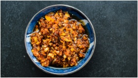 A vibrant bowl of spicy chili oil with garlic and pepper flakes, ideal for enhancing meals.