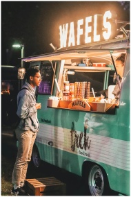 A customer waits at a vibrant waffle food truck in Weert, Netherlands at night.