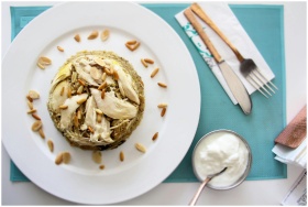 Delicious Middle Eastern chicken and rice dish garnished with pine nuts and almonds, served with creamy yogurt.