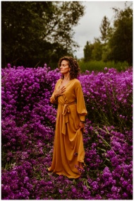 A woman in an orange dress stands meditatively in a field of vibrant purple flowers.