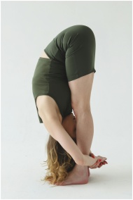 Adult woman demonstrating yoga flexibility with a forward bend pose in a studio setting on a white background.