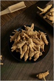 Detailed shot of dried ginseng roots on a dark pla
