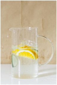 Glass pitcher with refreshing citrus and cucumber infused water on a white surface.