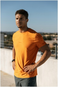 Fit man in orange shirt poses confidently on rooft