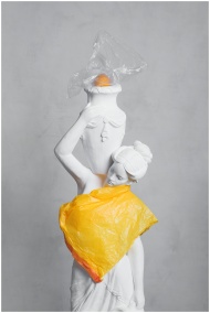 A white statue wrapped in vibrant plastic bags highlighting modern pollution.