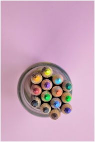 Colorful pencils in a glass jar from above on a pa
