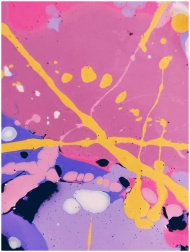 Dynamic abstract painting featuring vibrant splashes of yellow, pink, and purple hues.