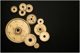 Close-up of gold gears arranged on a black backdrop, symbolizing teamwork and technology.