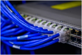Detailed view of blue ethernet cables connected to a network switch in a data center.