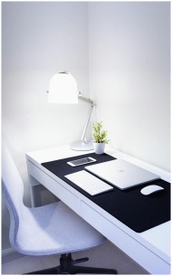 Sleek, modern home office setup featuring Apple devices, a desk lamp, and a plant.