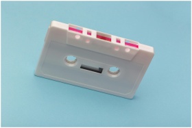 Vintage white cassette tape against a vibrant blue