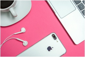 A modern workspace with laptop, smartphone, and coffee cup on a vibrant pink background.