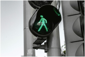 Close-up of a green pedestrian traffic signal indicating walk at an intersection.
