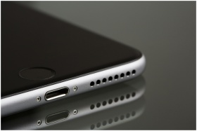 A sleek smartphone close-up highlighting its lightning connector and speaker, reflecting on a surface.