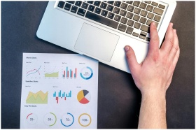 Overhead view of a business workspace with a laptop and colorful data charts on paper.