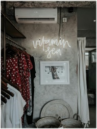 Chic Bali boutique featuring fashion items, a neon 'Vitamin Sea' sign, and bohemian decor.