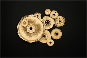 Close-up of golden cogs and gears arranged on a bl