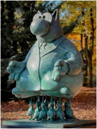 Bronze cat sculpture with birds in an autumn park