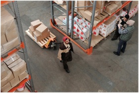 Team working in an industrial warehouse discussing and organizing inventory with pallets.