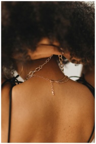 Close-up of a woman adjusting a gold necklace, highlighting elegance and style.